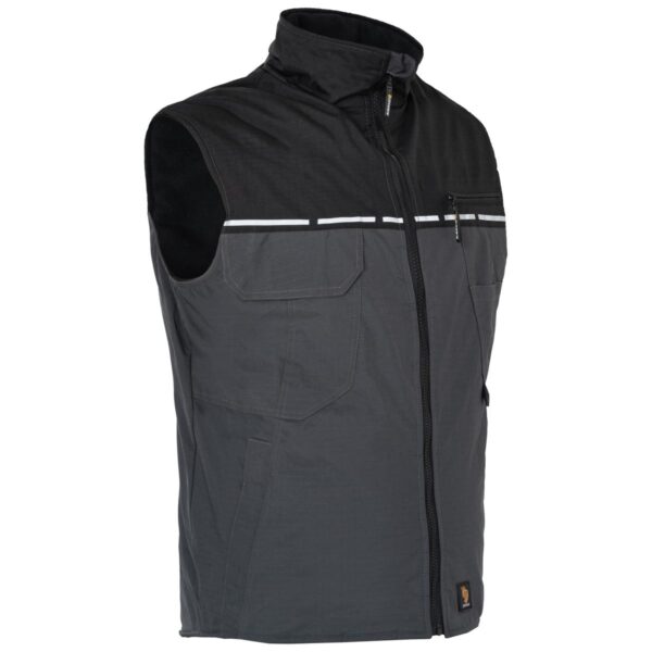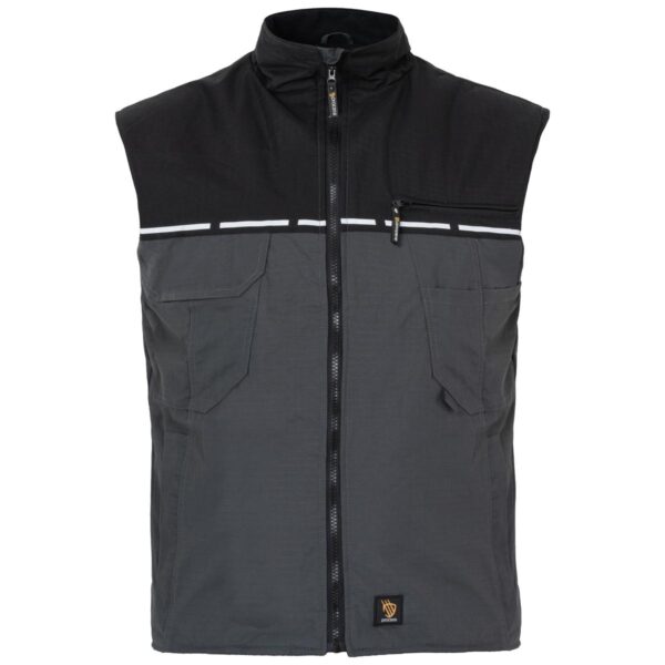 Bezrękawnik ocieplany wykonany w 100% z trwałego, impregnowanego wodoodpornie poliestru z wykończeniem “RIP-STOP”, ocieplany w całości od wewnątrz polarem, zasuwany na zamek błyskawiczny. Posiada sześć wygodnych i funkcjonalnych kieszeni. Przedłużony ocieplany tył dla lepszego komfortu. Nowoczesny design. Kolory: szary/czarny. Rozmiary: S – XXL.