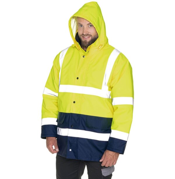 Dwukolorowa ciepła kurtka ostrzegawcza chroniąca przed zimnem i deszczem; wytrzymały materiał typu oxford; taśmy odblaskowe zapewniające najwyższą widoczność oraz bezpieczeństwo; wykończenie materiału water-repellent zapobiegające osiadaniu wody; klejone szwy; pikowana podszewka zapewniająca doskonałą izolację cieplną; regulowany kaptur chowany w stójce; dwie przednie kieszenie kryte listwą; kieszeń na piersi zamykana na zamek, ukryta pod listwą osłaniającą zamek główny; wewnątrz kieszeń zamykana na rzep; zamek główny kostkowy, kryty listwą zapinaną na zatrzaski; rękawy wykończone elastycznym mankietem od wewnątrz; rozpinany dół od wew. umożliwiający znakowanie; zgodny z normami: EN ISO 20471: 2013 / A1:2016 klasa 3; EN 14058:2017