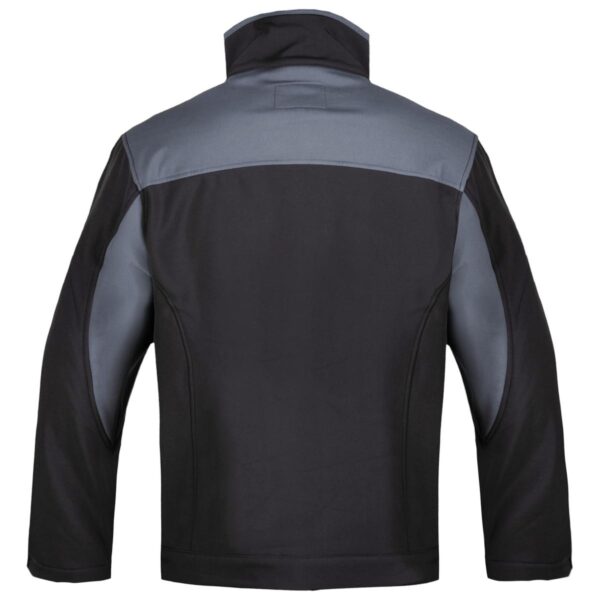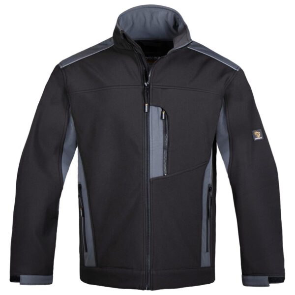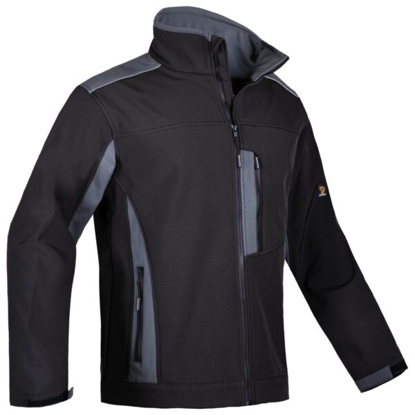 Kurtka softshell (100% poliester) w kolorze czarnym z ciemnoszarymi wstawkami. Kieszeń piersiowa i kieszenie boczne zapinane na zamek. Kostkowy zamek główny i zamki w kieszeniach. Odblaskowe elementy na barkach zwiększające widoczność. Obwód rękawów regulowany na rzep, zapewniając lepsze dopasowanie. Produkt spełnia wymogi normy PN-EN ISO 13688:2013