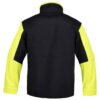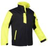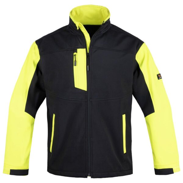 Kurtka softshell (100% poliester) w kolorze czarnym z żółtymi elementami. 3 kieszenie zapinane na suwak. Kieszeń piersiowa zapinana na suwak w kontrastowym kolorze, kieszenie boczne zapiane na suwak ukryte pod plisą. Obwód rękawów regulowany na rzep, zapewniając lepsze dopasowanie. Produkt spełnia wymogi normy PN-EN ISO 13688:2013.