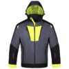 Kurtka sofshell (100% poliester) w kolorze szarym z czarnymi wstawkami oraz żółtymi i odblaskowymi elementami dla poprawy widoczności. Dwie kieszenie piersiowe oraz kieszenie boczne zapinane na suwak. Odpinany kaprur z podszewką z żółtej siatki i z regulacją obwodu za pomocą stoppera. Obwód rękawów regulowany na rzep, zapewniając lepsze dopasowanie. W dolnej części rękawów wszyta odblaskowa lamówka. Produkt spełnia wymogi normy PN-EN ISO 13688:2013.